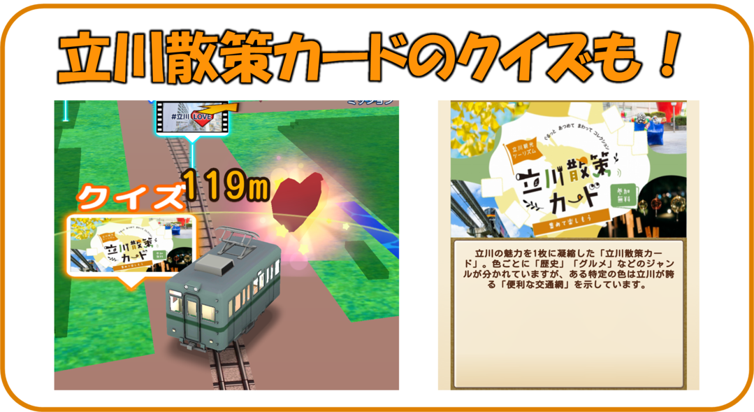 立川駅周辺のクイズやスポットを巡ってポイントを集め、立川LOVEランクを上げましょう。