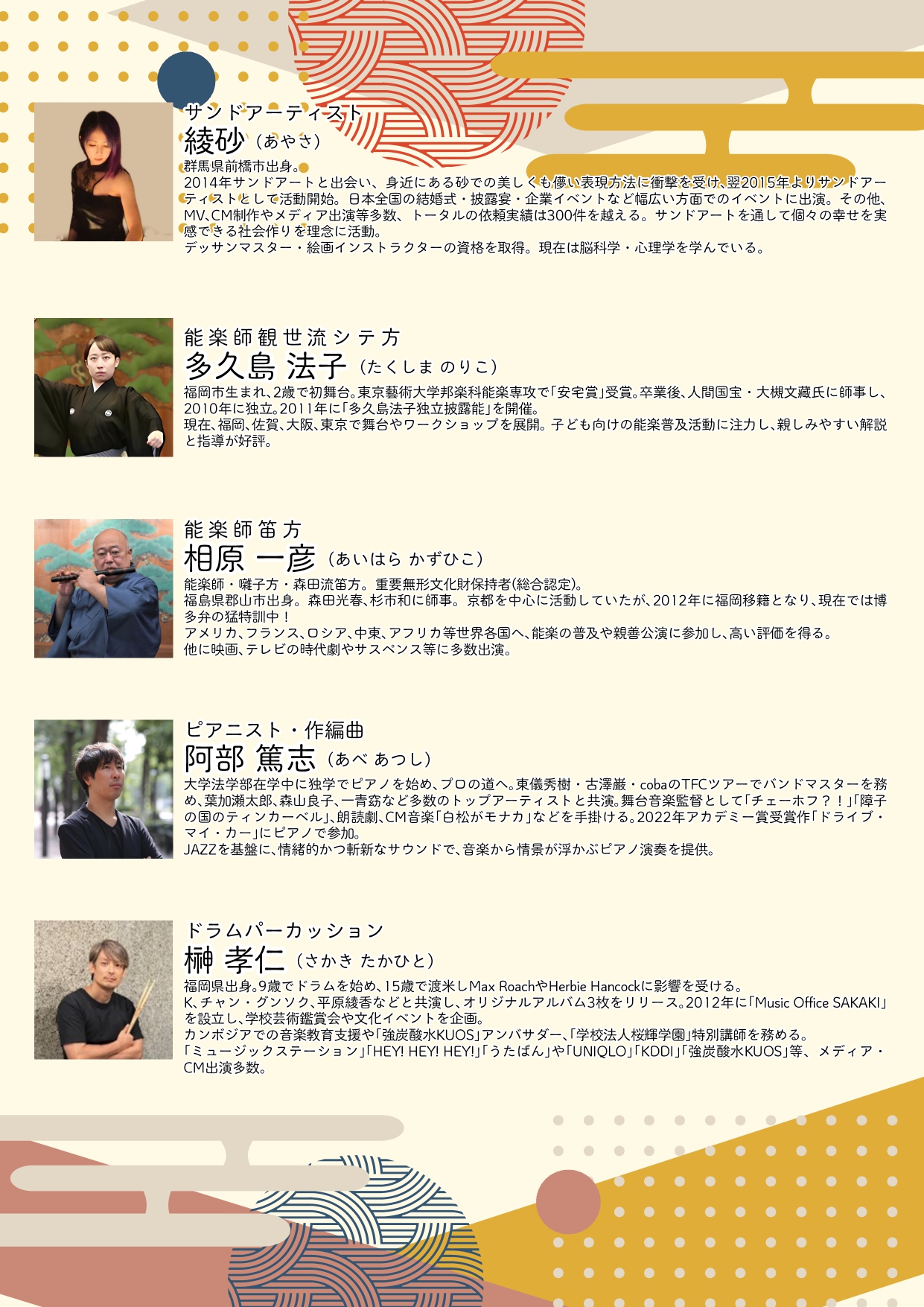「猩々」「船弁慶」といった【能】の代表的な演目を題材に、能楽師の舞と、ピアノ・ドラムス・能笛の演奏にあわせて、物語の世界をライブで描き出します。