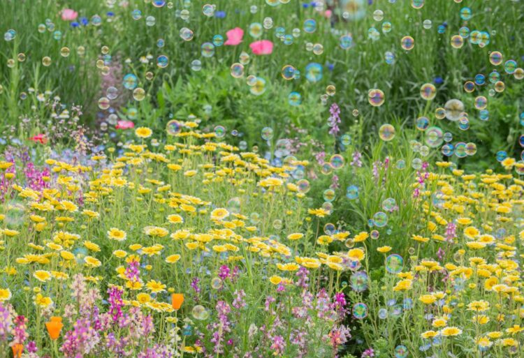 花畑にたくさんのシャボン玉が浮かびます!1回30分間限定の幻想的な光景をお楽しみいただけます。